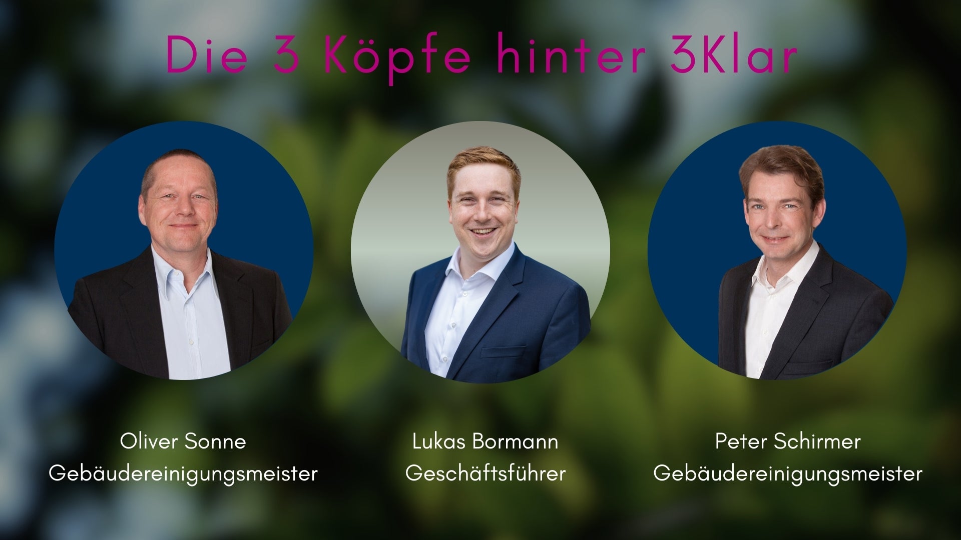 Erfahren Sie mehr über die Köpfe hinter 3Klar. Die Idee wurde von Lukas Bormann, Peter Schirmer und Oliver Sonne ins Leben gerufen. Die drei Gründer bringen jahrelange Erfahrung in der Gebäudereinigungsbranche mit und sind somit Experten auf dem Gebiet der Reinigungstechniken und -materialien. Während Peter Schirmer und Oliver Sonne ihr fachliches Know-how als Meister im Gebäudereinigerhandwerk einbringen, deckt Lukas Bormann mit seinem betriebswirtschaftlichen Studium den organisatorischen und betrieblichen Aspekt ab und ist aber auch inzwischen seit Jahren in der Gebäudereinigungsbranche tätig.
